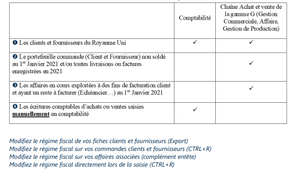 Cegid Sprint XRP : les mécaniques de TVA UE et hors UE sont définies en fonction du régime fiscal de TVA, ce dernier étant attribué dans chaque fiche client ou fournisseur puis porté par les pièces commerciales d’achats ou ventes (commandes, livraisons, facture…) et/ou écritures comptables. Il conviendra donc de modifier le régime fiscal sur :